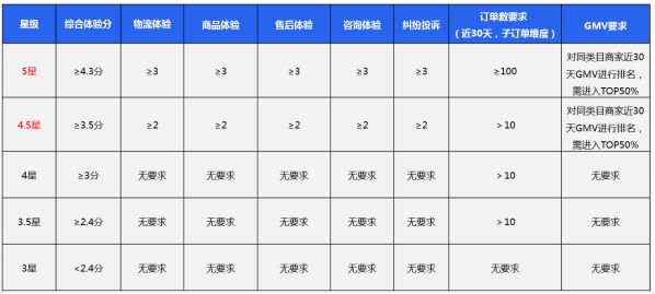 店鋪服務(wù)星級(jí)共為5檔(3星、3.5星、4星、4.5星、5星),最低3星,最高5星,星級(jí)越高,代表服務(wù)越好。