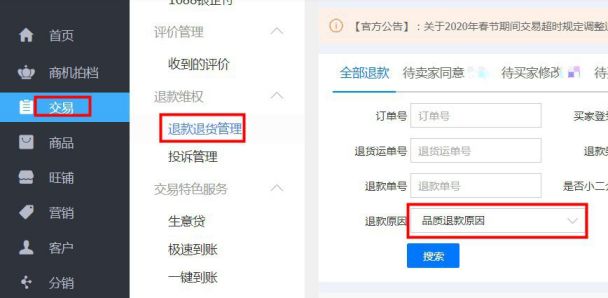 就要經(jīng)常看看買家是哪些品質(zhì)原因來(lái)退的 ,下圖是查看品質(zhì)退款歷史訂單的入口