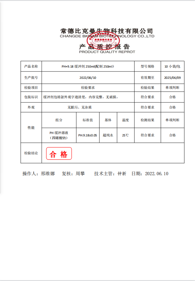 比克曼生物 PH緩沖劑 PH=9.18緩沖劑 250ml(配制250ml) 110702004 20220610
