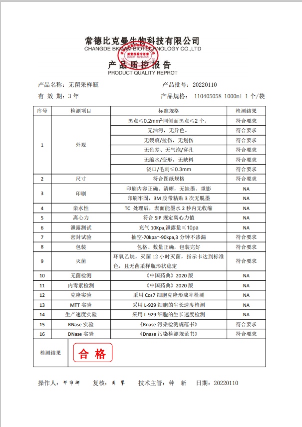 比克曼生物 無菌采樣瓶 1000ml 獨立裝 110405058 20220110