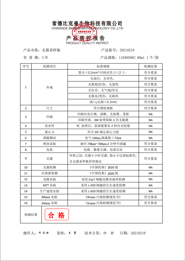比克曼生物 無菌采樣瓶 60ml 獨(dú)立裝 110405062 20210218