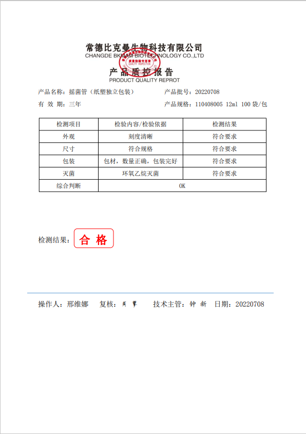 比克曼生物 搖菌管(12ml 紙塑獨(dú)立包裝)1個(gè)袋 100袋包 110408005 20220708