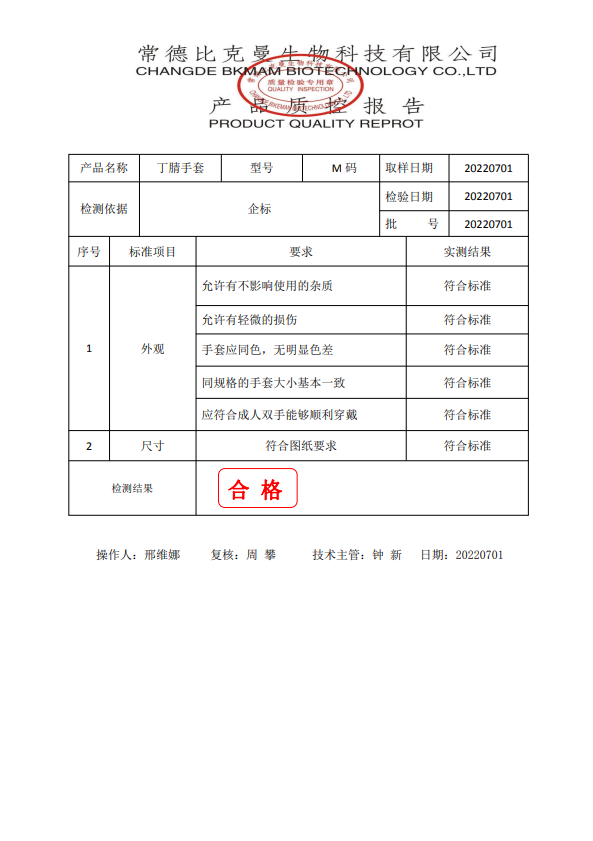 比克曼生物 丁腈手套 M碼 50雙盒 110601013 20220701 質檢報告