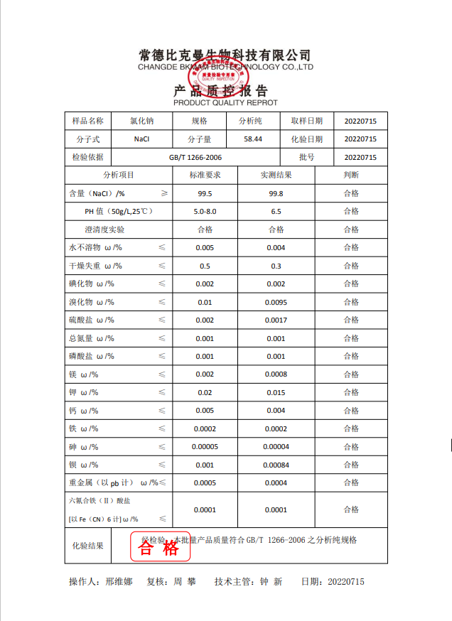比克曼生物 氯化鈉 AR 分析純 500g瓶 110702034 20220715