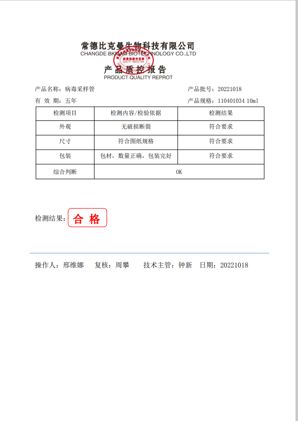 比克曼生物 病毒采樣管(棉蓋,不擰蓋,非滅菌) 10ml 110401034 20221018