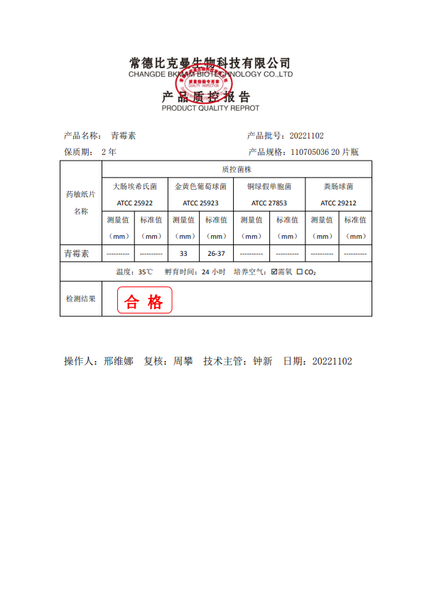 比克曼生物 青霉素 20片瓶 110705036 20221102