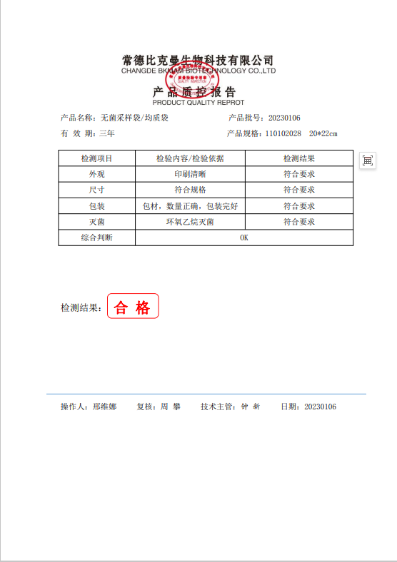 110102028 比克曼生物 立式無(wú)菌采樣袋 20x22(帶壓條) 100個(gè)裝 20230106