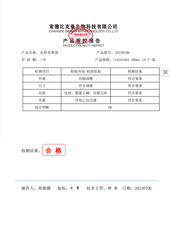 110101004 比克曼生物 水樣采集袋 (含硫) 500ml 10個(gè)袋 20230106