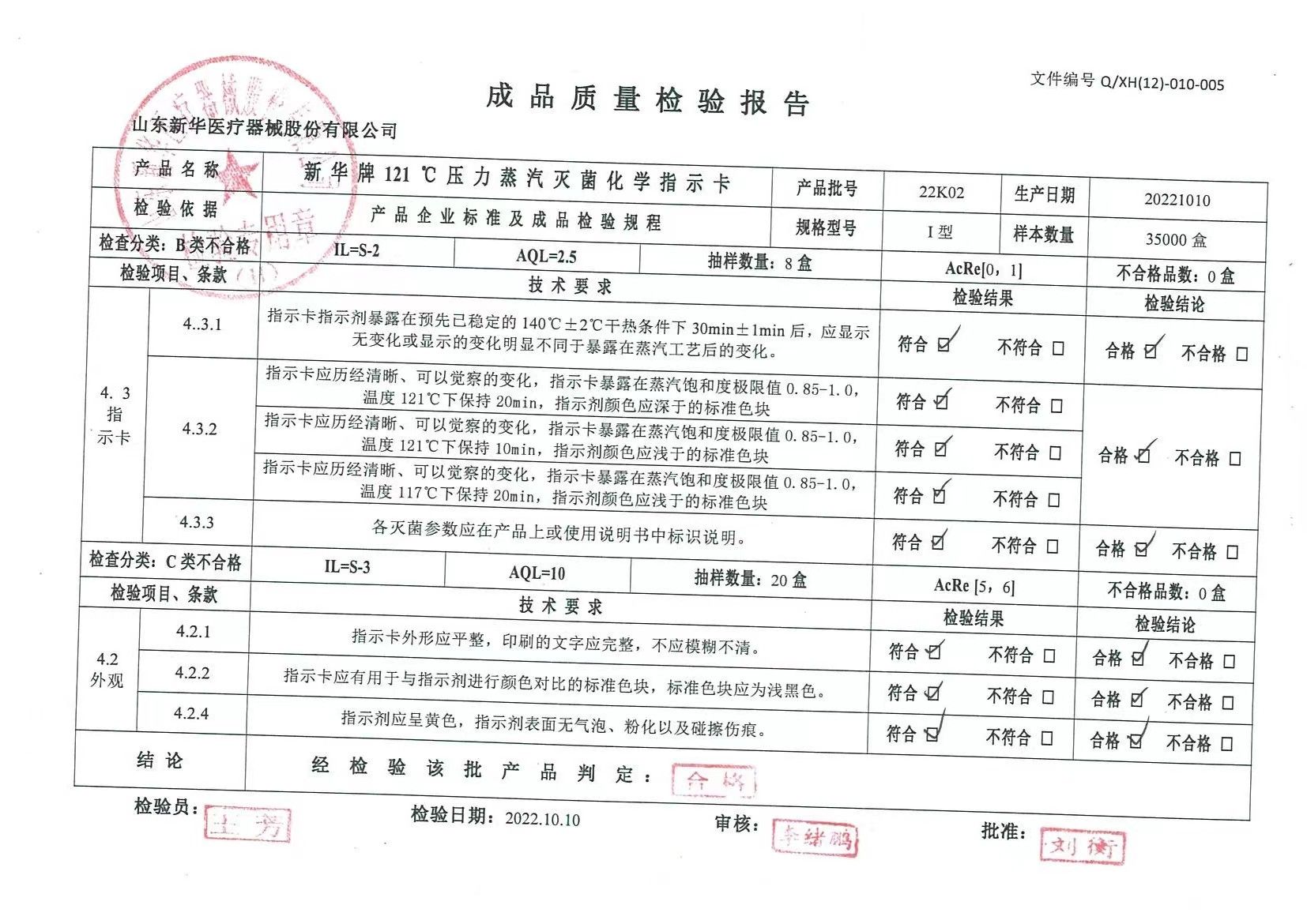 新華牌 121℃壓力蒸汽滅菌化學(xué)指示卡 I型 批號22K02 生產(chǎn)日期 20221010