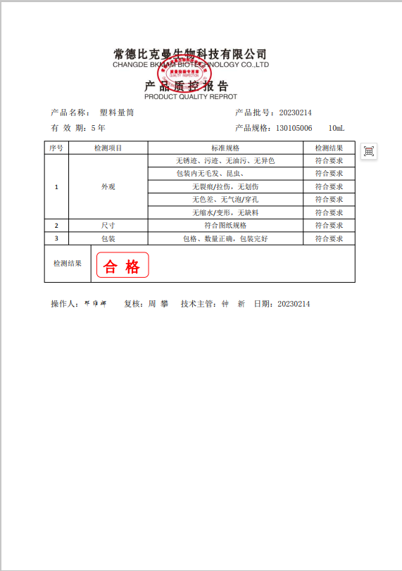 130105006 BKMAM 塑料量筒 10ml 20230214