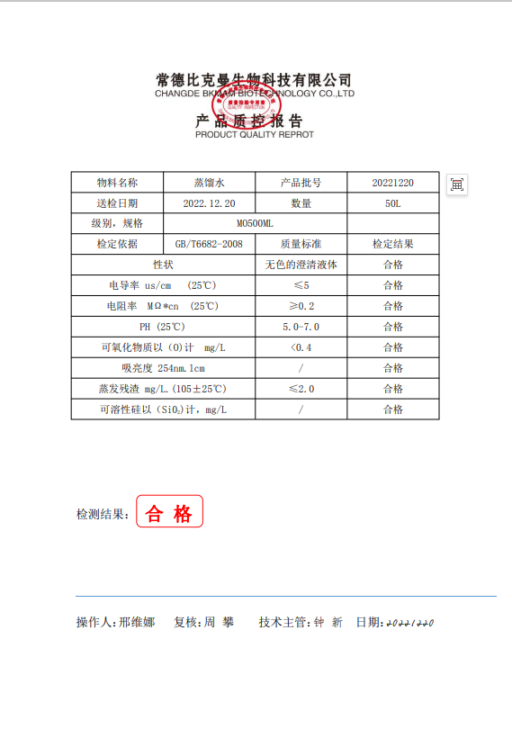 110702069 比克曼生物 蒸餾水 500ml 瓶 20221220