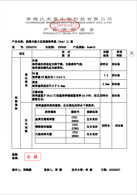 110704032 比克曼生物 胰蛋白胨大豆瓊脂(三層包裝) TSA瓊脂平板 9cm 10個(gè)袋 23032701