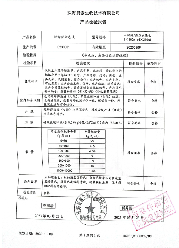貝索 姬姆薩染色液 血細胞 瘧原蟲染色 1x100ml; 4x250ml C230301