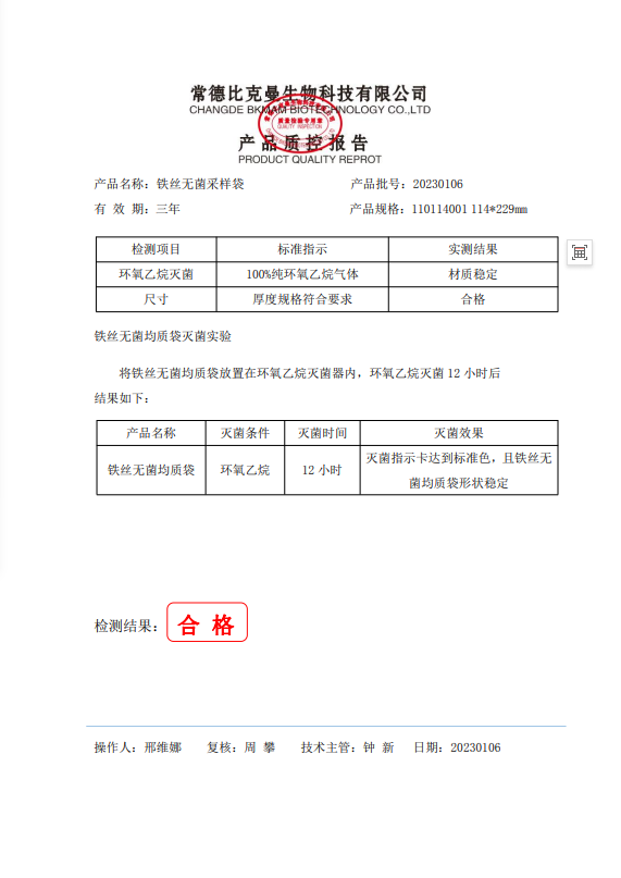 110114001 比克曼生物 鐵絲無菌采樣袋 114x229 (帶書寫區(qū)域) 100個裝 20230106