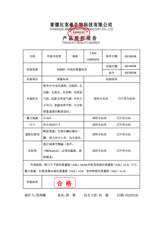 110401015 比克曼生物 外旋冷凍管 (凍存管) 2.0ml 100個(gè)袋 20230328