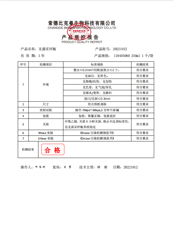 110405060 比克曼生物 無(wú)菌采樣瓶 250ml 獨(dú)立裝 1個(gè)袋 20221012