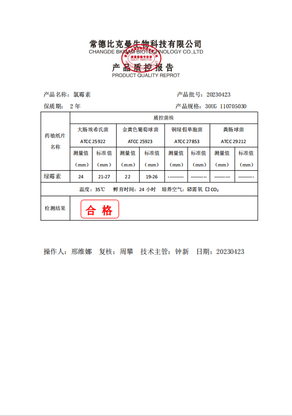 110705030 比克曼生物 氯霉素 30UG 20片瓶 20230423