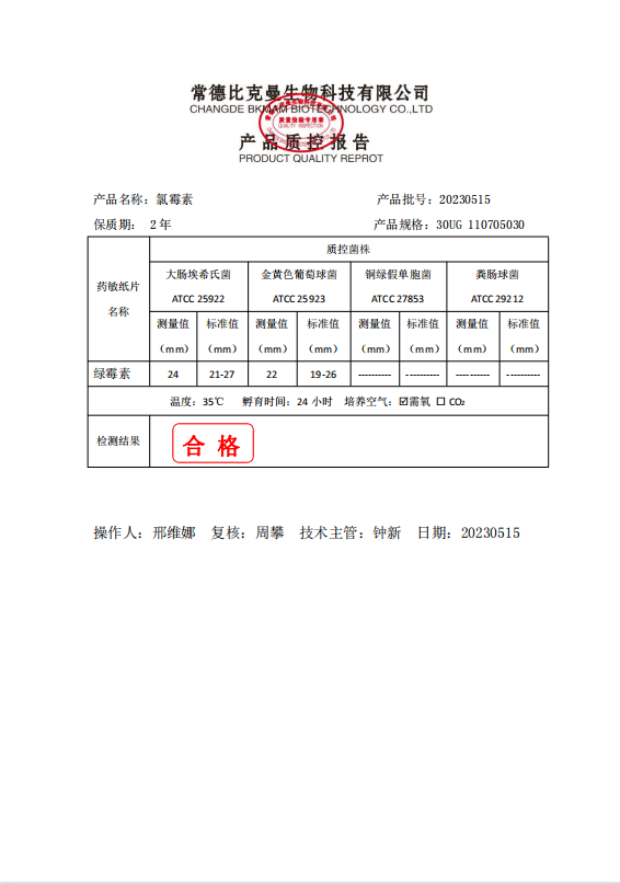110705030 比克曼生物 氯霉素 30UG 20片瓶 20230515