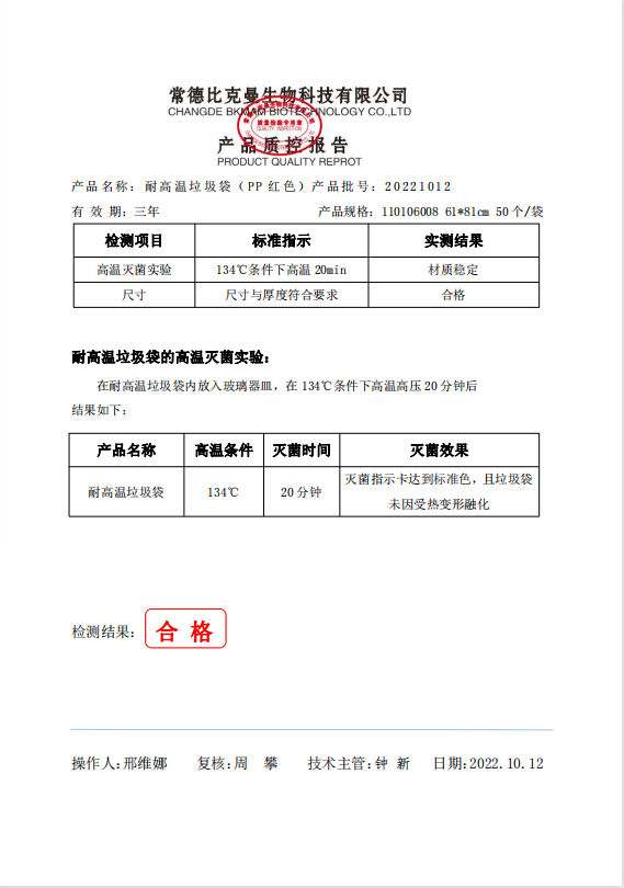 110106008 比克曼生物 耐高溫垃圾袋生 紅色 61x81cm (PP復(fù)合膜材質(zhì)) 50個袋 20221012