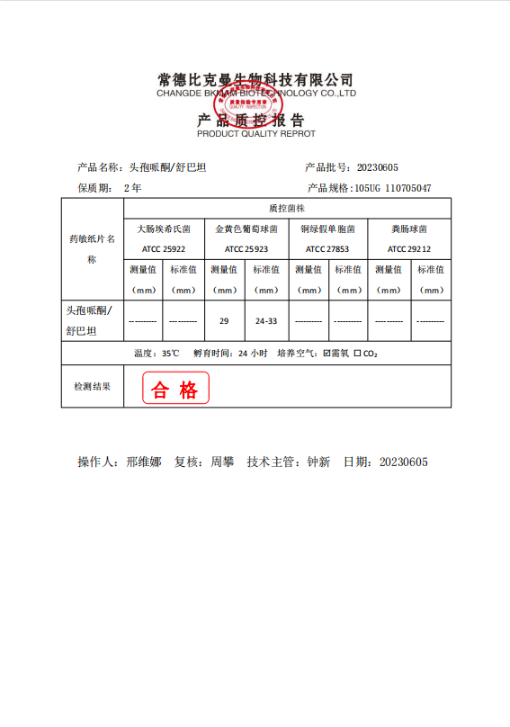 110705047 比克曼生物 頭孢哌酮 舒巴坦 105UG 20片瓶 20230605