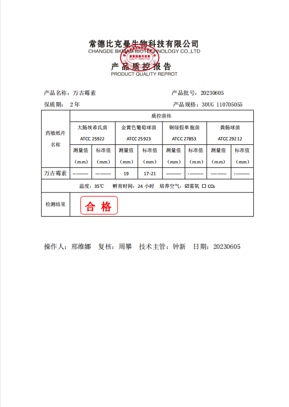110705055 比克曼生物 萬(wàn)古霉素 30UG 20片瓶 20230605